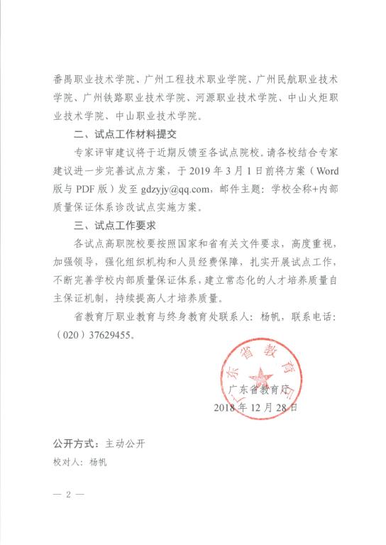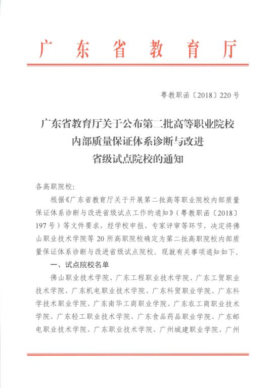 日前,省教育厅发布《广东省教育厅关于公布第二批高等职业院校内部质量保证体系诊断与改进省级试点院校的通知》(粤教职函﹝2018﹞220号),我校被确定为内部诊改试点院校。至目前,全省两批诊改试点院校共有27所。