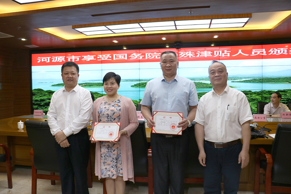 2019年4月25日上午,河源市人力资源和社会保障局在人社局三楼会议室召开河源市享受2018年度国务院政府特殊津贴人员颁奖仪式。河源市政府副秘书长冯伟斌,市委组织部人才科科长叶有碧;我校党委书记韦荣同志、副校长赖小景;市人社局党组书记局长邓小强、副局长张燕雄和相关科室人员参加仪式。