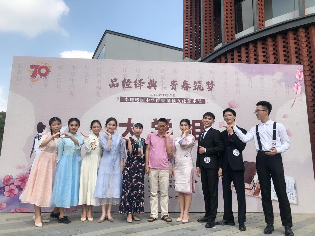 为响应教育部、国家语委、省教育厅等部门关于《中华经典诵读工程实施方案》的号召,我校大力支持师生团队参加“2018—2019学年度南粤校园中华诵读经典文化艺术节”。5月18日,以“品经绎典·青春筑梦”为主题的南粤经典诵读艺术节决赛在江门五邑大学成功举行。我校人文学院副教授郑尔君老师带领师生团队参加了比赛。
