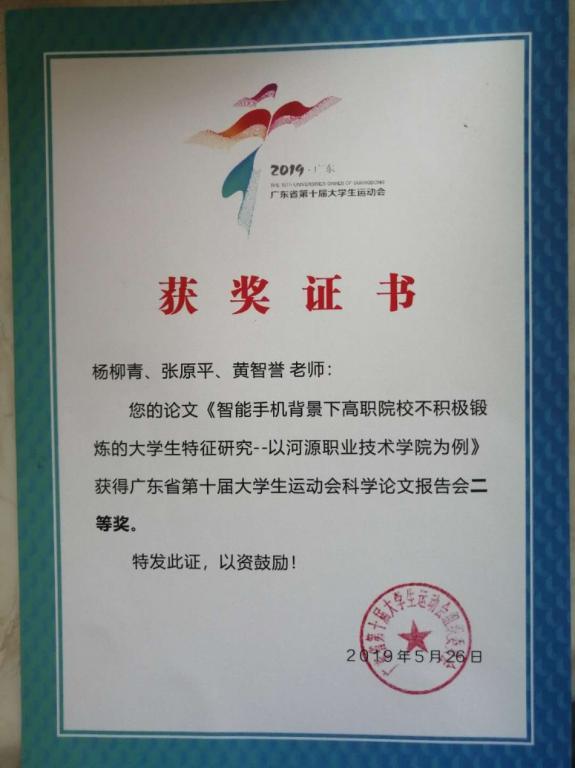根据《广东省教育厅关于举办广东省第十届大学生运动会科学论文报告会的通知》(粤教体函﹝2019﹞4号)文件精神,我校体育教研室组织教师积极参与,共有11人撰写的22篇论文送审至由深圳大学承办的科报会。本届科报会共收到相关单位报送论文1377篇,获奖572篇(一等奖48篇,二等奖212篇,三等奖312篇)。经专家评审、查重和评审委员会确认,我校有3篇论文获奖,其中杨柳青老师的《智能手机背景下高职院校不积极锻炼的大学生特征研究——以赢博线上官网(集团)官方网站为例》和《校园体育文化的特色引领与建设路径研究》分别获得二、三等奖,殷国龙老师的《论散打侧踹腿技术训练及运用》获三等奖。同时,杨柳青老师获邀参加了此次科报会,就获得二等奖的论文进行了汇报和答辩,与全省体育同行们对高校体育教育等方面进行了深入细致的研讨。