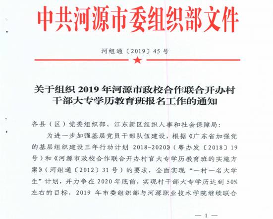 近日,中共河源市委组织部下发了《关于组织2019年河源市政校合作联合开办村干部大专学历教育班报名工作的通知》(河组通〔2019〕45号),今年我市再组织500名村干部报读我校大专函授班,拟录取400人,届时我校村干部大专班学员总规模将突破4000人。