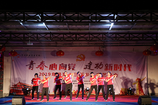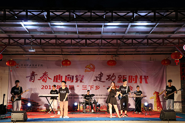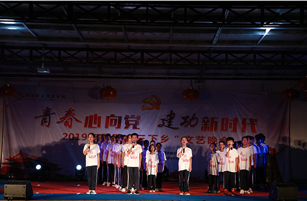 本次晚会以“青春心向党,建功新时代”为主题,践行习近平新时代中国特色社会主义思想和党的十九大精神,通过歌舞、小品、朗诵等节目为村民们带来了一场精彩的表演。晚会在我校筑梦乐团《自由的世界》《没有什么不同》中拉开序幕;由下石幼儿园以及下石小学学生表演的歌舞《留守的孩子》《唱花儿的花儿》以朝气蓬勃的姿态展现了小朋友天真可爱的天性;下石村广场舞表演队表演的《中国红》《姑娘我等你》展现了广场舞激情迸发、活力飞扬的魅力,向观众展示着自身良好的精神面貌;下石小学学生朗诵的《中华颂》用嘹亮的声音响彻全场,以豪迈的气势振奋人心,赢得现场观众纷纷拍手叫好;我校邓云锋与徐冰冰分别带来了歌曲《当那一天来临》《红旗飘飘》。在他们气势恢宏的歌声中,表现出浓郁的爱国主义情怀,传递了对建设社会主义现代化国家的美好憧憬。最后,晚会在歌伴舞《祝福祖国》中圆满落下帷幕。期间,下石村书记陈泽代表下石村与我校团委副书记黄志鹏互赠锦旗。
