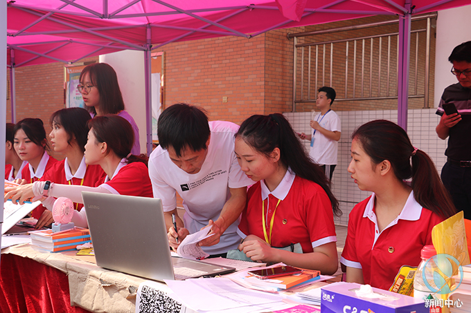 为了让新生可以更加方便、快捷地完成注册入学,我校在校外的河源市火车站、新城客运站等迎新报到点设立了接站志愿者队伍并且安排车辆接送新生到校,在校园内设立了新生引导志愿者队伍,热情积极的帮助到校新生提行李、带路、引导新生完成报到工作及入学事务;还设立了校内咨询服务站给新生提供咨询服务,为新生和家长担当校园导游,耐心地为新生以及家长答疑解惑,为新生介绍学校的环境及相关情况,帮助新生尽快了解和适应学校环境;在学校道路设立了校外车辆引导志愿者队伍协助保卫人员指挥交通,引导家长的车辆出入停放。此外学校还设立了多个学生家长休息区以及行李寄放区,为新生及家长提供休息等候的场所。各个岗位的志愿者身着鲜艳的红色短袖,不辞辛苦,认真工作,志愿者们以饱满的精神状态投入到迎新工作之中。