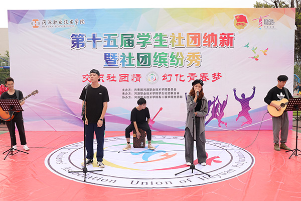 活动现场,各社团百花齐放,尽显风采。伴随着动感的音乐,街舞协会带来的《B-boy show》瞬间点燃全场的热情;吉他协会以娴熟的歌唱技巧及动听的声线演唱了《爱的飞行日记》、《一场游戏一场梦》,现场观众陶醉之中;古筝协会《小小竹排》给现场观众带来一场听觉盛宴;海燕话剧社以精湛的演技与诙谐的表演风格呈现了一场情节丰富的《非诚勿扰》节目;不仅如此,每个社团协会以自己的方式轮流上台表演,有动听的歌曲、刚劲有力的武术、精彩绝伦的舞蹈表演等,各展示出本社团的特色,为自己的协会进行宣传。跑旗环节更是把现场的气氛带到了高潮,各社团高举会旗,展示了我校学子激情四射的精神状态。期间,我校团委陈晓峰书记、团委办公室主任黄志远老师亲临设点摆摊的社团协会,与社团工作人员亲切交谈,并对他们给予肯定和支持。