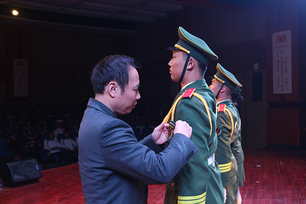 我校党委委员、宣传部部长赖新优为第一中队授臂章