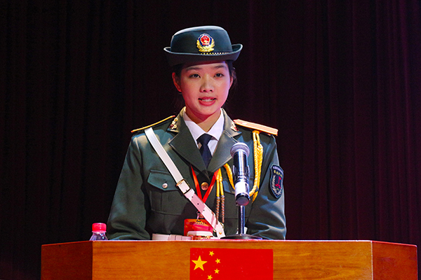 紧接着,国旗护卫队卸任大队长杨婉仪同学上台发言,她回顾了过去一年里国旗护卫队的训练、学习和活动,向学校领导、老师对国旗护卫队的悉心栽培与指导以及对全体队员共同的努力表示衷心的感谢。鉴于过去一年国旗护卫队的出色表现,国旗护卫队黄旺庆教官为退役队员颁授纪念徽章,充分肯定了国旗护卫队一年来所取得的成绩。而后,国旗护卫队新任大队长在上台发言中表示,在今后的工作中将会不断对队伍进行改革创新,全面加强队员们思想观念、工作作风建设,发扬国旗护卫队光荣传统,以“求真,务实,开拓,创新”的奋斗精神完成每项任务,用火红青春谱写国旗辉煌。