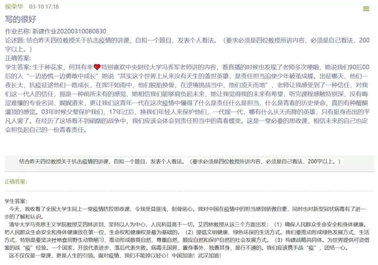 思政大课课堂邀请了艾四林、秦宣、王炳林、冯秀军四位教授,结合思想政治理论课的教学内容,解读党中央关于疫情防控的决策部署,分析中国抗疫彰显的中国共产党的领导和中国特色社会主义制度的显著优势,讲述防疫抗疫一线的感人故事,并进行了网络现场答疑。思政部结合本次“思政大课”情况,组织学生进行了在线讨论,并把学生参与讨论情况作为学生平时成绩的重要部分。通过讨论深化对相关内容的认识,引导广大学生传承和弘扬爱国主义精神,深刻认识中国共产党领导和中国特色社会主义制度的显著优势,坚定“四个自信”。