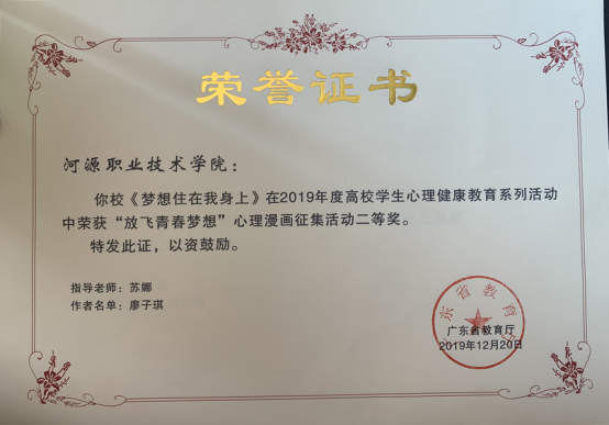 近日,广东省2019年度高校大学生心理健康教育系列活动评选结果揭晓,我校在心理漫画、主题演讲及公益广告三项活动中获奖。其中,艺术学院苏娜老师指导廖子琪同学的《梦想住在我身上》心理漫画获得二等奖,机电学院廖若莎老师指导张民、张圣镁同学的《阳光旅程》公益广告和机电学院赵雯钊老师指导钟琳琳同学的《少年中国志》主题演讲获得三等奖。
