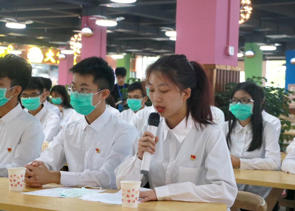 学生党员代表、电信学院19计算机网络2班的张雅婷同学作了发言,作为学生党员代表作出倡议和表态,表示一定会做增强厉行勤俭节约、制止餐饮浪费政治自觉的表率,做落实厉行勤俭节约、制止餐饮浪费有关制度的表率,做引领厉行勤俭节约、制止餐饮浪费文明新风的表率,做厉行勤俭节约、制止餐饮浪费班委宣传教育的表率,一定带头从点滴做起、从校园做起、以身作则,率先垂范,以强有力举措落实习近平总书记重要批示精神,努力使艰苦奋斗、勤俭节约在校园蔚然成风!