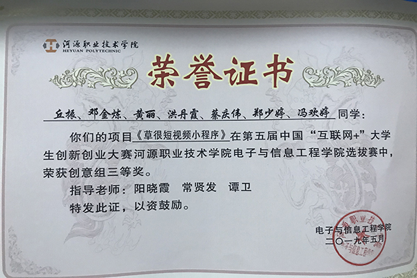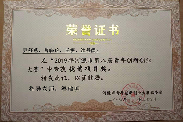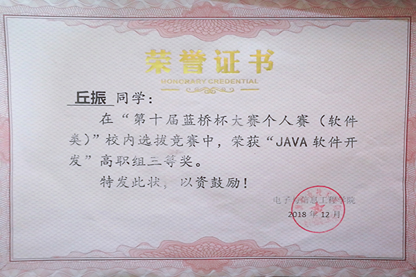 为锻炼自我,提高自身能力,丘振在大一期间踊跃报名学生组织和社团,尽管并未通过,但他永不气馁,重振旗鼓后将目光转向其他锻炼平台。在接下来的日子里丘振展现出自己坚韧不拔的优点,通过努力荣获赢博线上官网(集团)官方网站第十四届校运会象棋比赛“优秀裁判员称号”;第十届蓝桥杯大赛个人赛(Java软件开发)校内选拔三等奖;第八届河源市青年创新创业大赛优秀奖。