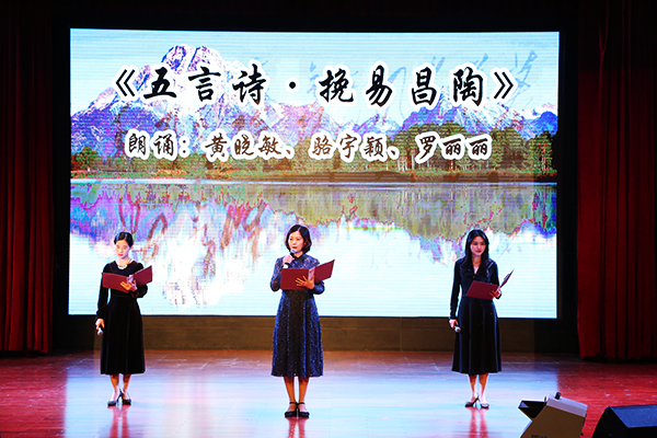 为纪念伟大领袖毛泽东诞辰127周年,12月24日晚,我校于艺术楼演播厅隆重举行《思•颂》毛泽东作品朗诵会。校党委书记韦荣,党委副书记、纪委书记叶国英,党政办主任汤剑冰,学工处处长戴陌阳,校团委书记陈晓峰,人文学院院长罗春娜,全体专兼职团干部及各学院师生代表均出席参加本次朗诵会。