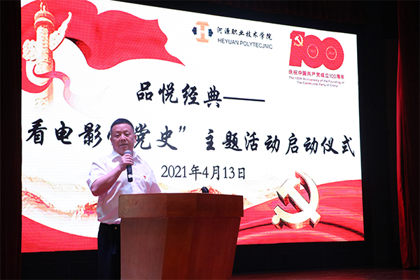 赖新优部长为本次活动致辞并宣布开幕。他表示,为庆祝中国共产党成立100周年,学校开展“看电影学党史”系列活动目的在于大力营造党史学习教育的浓厚氛围,让广大学生通过看电影的方式了解党的光辉历程和伟大成就。引导学生学党史,感党恩,跟党走。并寄语广大学生要打好基础,学好本领,坚定理想信念,努力成为社会主义事业合格建设者和接班人。开幕仪式结束后,全体师生观看电影《建国大业》。