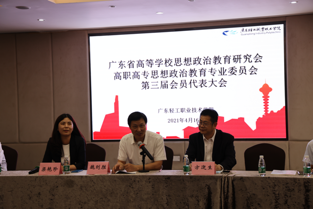4月16日下午,张国勇副校长带队参加广东省高等学校思想政治教育研究会(以下简称“研究会”)高职高专思想政治教育专业委员会(以下简称“专委会”)第三届会员代表大会。大会在广东轻工职业技术学院隆重举行,广东省高等学校思想政治教育研究会秘书长魏则胜教授、会员单位党委书记或党委副书记、分管校领导、马院院长或思政部主任共70余人出席大会。