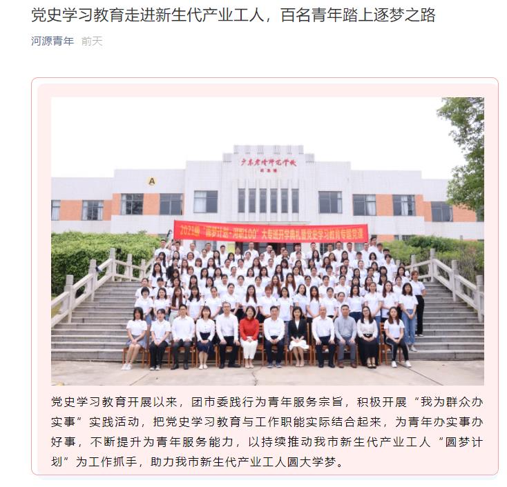 5、2021年4月19日,河源青年微信公众号报道《党史学习教育走进新生代产业工人,百名青年踏上逐梦之路》。报道网址链接:https://mp.weixin.qq.com/s/3QCVLrXGAUVrmEE5L_AzmQ
