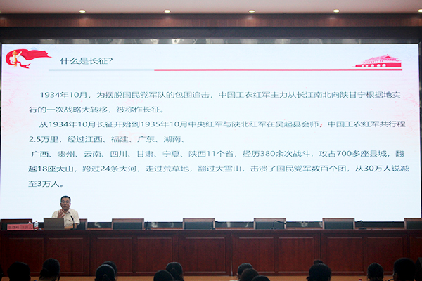 “五四”表彰大会结束后,团委陈晓峰书记以《永远的长征》为主题给第二十五期“青马班”二班全体学员授课。陈晓峰主要从何为长征、为何要长征、长征中经历的困难、长征的历史意义及长征中应学习的精神五个方面展开讲解,带领学员们更加深入了解长征的历史,体会长征的艰苦,学习长征的精神。陈晓峰指出,长征是人类战争史上的奇迹,是一次伟大的远征,我们广大青年大学生都要大力弘扬伟大的长征精神,在新的长征路上奋勇前进,为实现中华民族伟大复兴贡献青春力量。