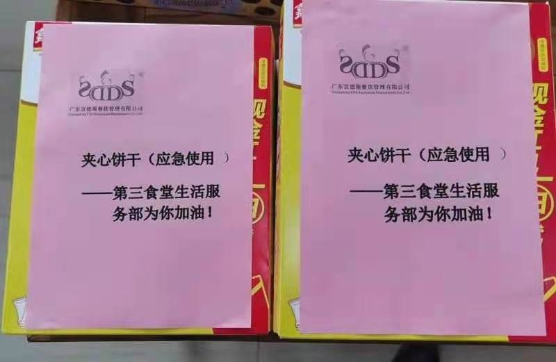针对军训学子在烈日下训练出现身体不适、低血糖等症状,第三食堂师生服务部免费为每一个训练营免费赠送夹心饼干供师生应急使用。