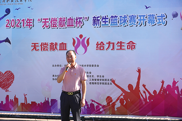 开幕式上,裁判组代表和运动员代表先后发言,表达了对赛事的期待与尊重,团总支书记杨日奎为赛事致辞,号召同学们弘扬体育精神,赛出河职院人的自信与风采。市中心血站党支部书记杨启兴宣布2021“无偿献血杯”篮球赛正式开始。