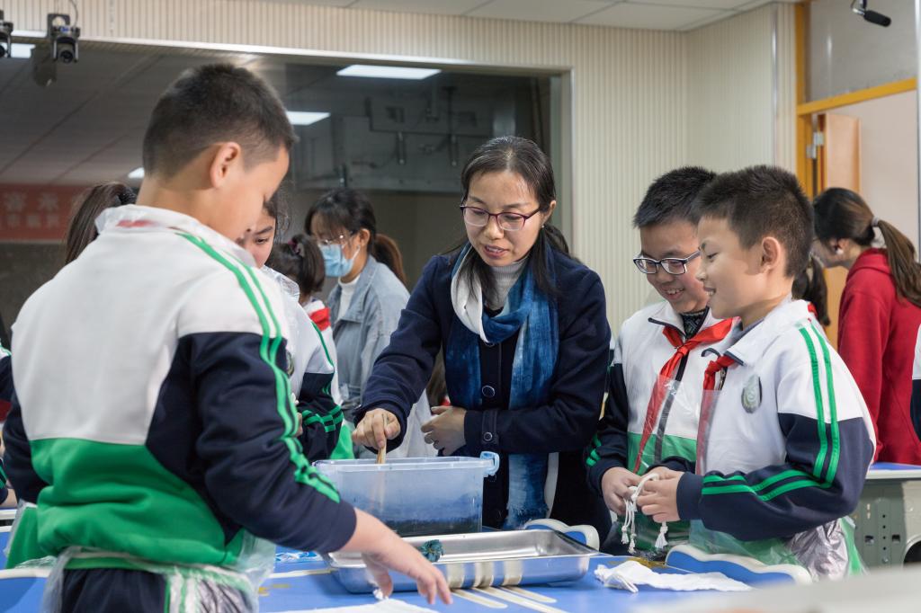 黄秀丽老师基于墩头蓝织染技艺,结合中小学生特点,精心设计了适合中小学生的非遗教育实践课程,其中不仅包括墩头蓝布艺蓝染制作体验,还包括客家传统文化相关知识。此次活动中,黄老师为学生讲解了墩头蓝的创设背景、制作材料和制作技艺等,并指导学生亲手制作蓝染作品。在黄老师耐心指导下,学生们用灵巧的双手,用简单环保的材料,费了一番工夫后,一件又一件创意十足的蓝染作品制作而成。学生们举着亲手制作的作品欣赏自己的劳动成果,满脸兴奋。