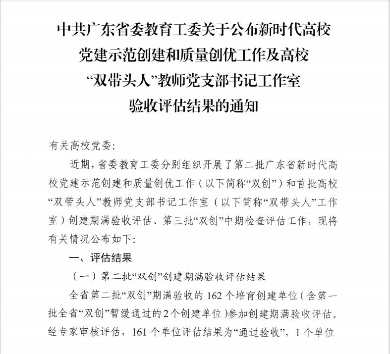近日,中共广东省委教育工委公布了第二批广东省新时代高校党建示范创建和质量创优工作结果,我校电子与信息工程学院党总支和继续教育学院第一党支部顺利通过验收。