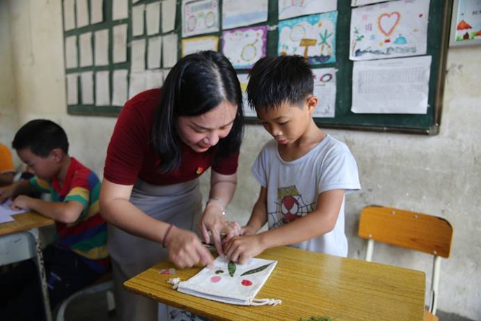 在植物拓染课上,胡叶娟老师介绍了植物拓染的起源与历史,并以图片、作品实物等情景导入,结合大自然中常用植物作特征分析,对植物拓染的步骤进行实操演示,并和其他党员教师、学生志愿者们在课堂上指导小学生亲手制作,最后和小学生们一起展示了五彩缤纷的植物拓染作品。