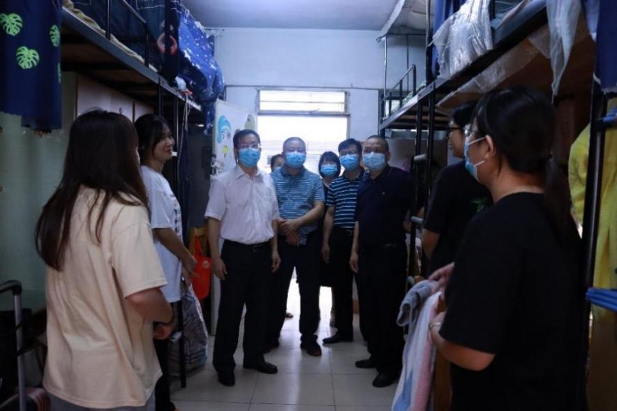 8月26日下午,学校党委书记韦荣带领资产后勤处、科研处、党政办和老隆师范学院的有关人员,深入B区学生宿舍,与学生面对面交谈,了解学生返校及疫情防控工作情况,确保校园安全。