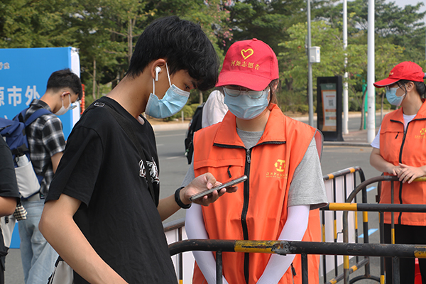 返校前,志愿者参加志愿服务工作培训会,在会上明确了志愿者管理、分工、志愿服务时间、地点以及要求等相关内容,也多次强调在志愿服务返校学生的同时,志愿者们务必要做好自我防护,并服从学校统一安排,勇敢地站在校园防“疫”第一线,为顺利返校提供志愿服务。工作中,志愿者遵循疫情防控要求,毫不懈怠,检查返校学生的粤康码、行程卡,并给学生测体温,检查无误后方可入校。