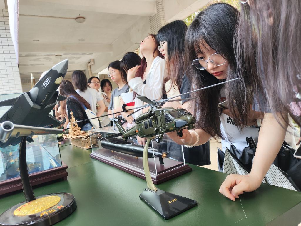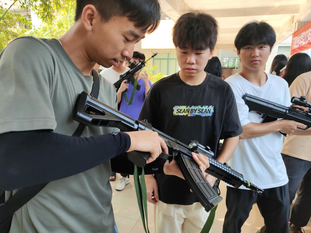 实践活动现场,同学们兴趣盎然,同学们纷纷将原来只在影视作品看到的“真家伙”拿在手上认真“把玩”,国旗护卫队的退伍军人学生们也不余遗力向同学们一遍又一遍认真介绍军械使用方法。