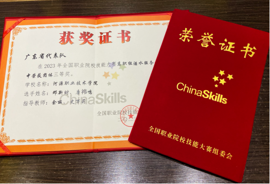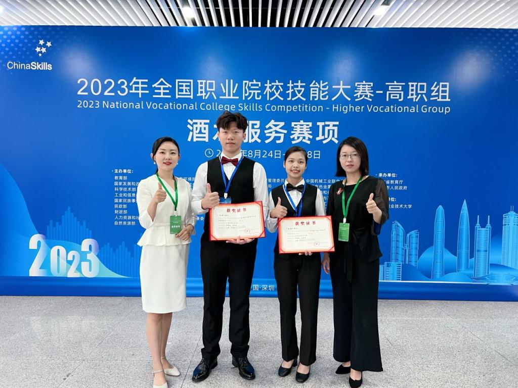 2023年全国职业院校技能大赛(高职组)酒水服务赛项于8月24日至27日在深圳职业技术大学举行。由我校余丽、史万莉老师指导的酒店管理与数字化运营专业学生邓新财、唐祎鸣同学凭借扎实的专业知识和较高的职业素养,在比赛中表现突出,荣获三等奖。