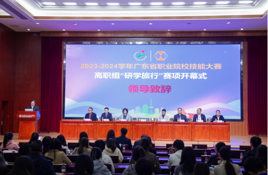 1月16日,2023-2024学年广东省职业院校技能大赛(高职组)“研学旅行”赛项开幕式在我校举行。韦荣书记,袁光华副校长,省教育厅派驻赛项督察员陈婧教授,专家组组长陈佳平教授,裁判长石媚山教授,仲裁组组长朱智教授,专家组成员吴肖淮教授、何曙光教授出席开幕式。各参赛校的领队、指导老师和选手参加开幕式。