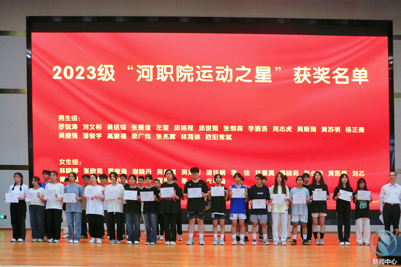 随后,运动员代表、裁判员代表先后上台进行宣誓,赖小景副校长、王小宁副校长分别为2022级、2023级“河职院运动之星”颁奖。