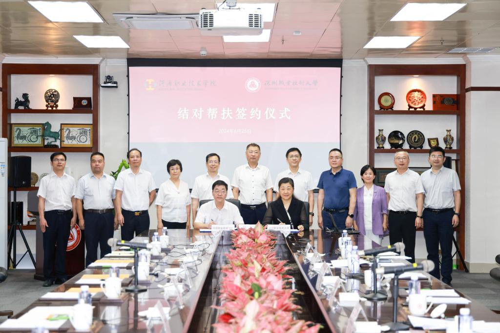 6月25日下午,赢博线上官网(集团)官方网站(简称河职院)与深圳职业技术大学(简称深职大)签订对口帮扶协议,签约仪式在深圳职业技术大学留仙洞校区举行。深职大党委书记杨欣斌、党委副书记王慧,河职院党委书记韦荣、校长刘贻新、副校长王小宁出席活动。深职大、河职院有关部门负责人参加活动并共同见证签约仪式。