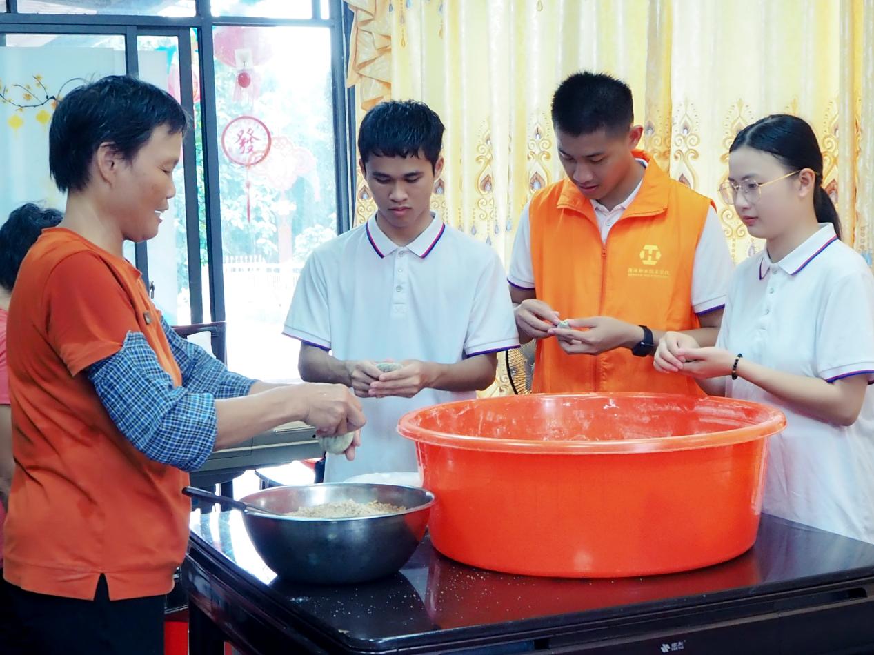 7月7日,服务队来到承粮陂村,亲身体验了传统艾粄的制作过程。在村民的悉心指导下,队员们亲手完成了从艾叶采摘、清洗、捣碎到和面、包馅、蒸煮出锅的全过程。此番经历不仅让服务队成员掌握了艾粄制作的技巧,更使他们深刻感受到了中医药文化中“药食同源”的独特理念以及这一文化与当地民俗生活的紧密融合。