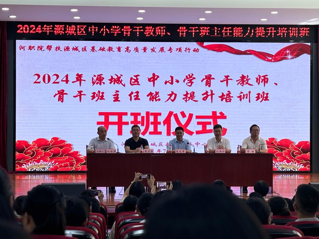 2024年7月15日上午,赢博线上官网(集团)官方网站(以下简称“河职院”)帮扶源城区基础教育高质量发展专项行动——2024年源城区中小学骨干教师、骨干班主任能力提升培训班开班仪式在源城区公园东小学报告厅隆重举行。河职院袁光华副校长、源城区教师发展中心主任李宏胜等领导及全体培训教师参加此次开班仪式。