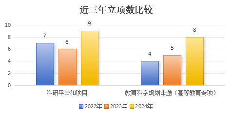 我校此次共获批项目17项,其中科研平台和项目9项(详见表1),立项数目在粤东西北地区高职院校排名第一;教育科学规划课题(高等教育专项)8项(详见表2),立项数目在粤东西北地区高职院校排名第二。我校这两类项目的立项数大幅提升,均超前两年(如图);立项总数在粤东西北地区高职院校排名第二,并已连续多年处于粤东西北高职院校前列。