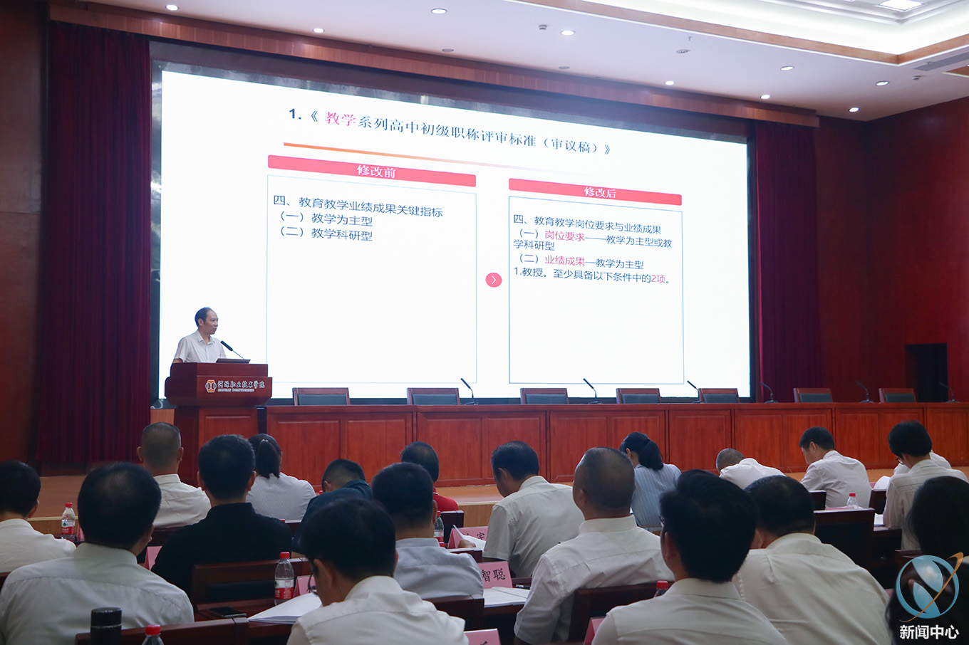 在会议上,学校党委委员、组织人事处处长黄建华从2023年职称评审概况、修订原则及修订内容等方面对《赢博线上官网(集团)官方网站职称评审制度文件》的修订情况进行了说明。该文件的修订旨在进一步规范和完善学校的职称评审工作,激励教职工提高立德树人水平、教学水平、学术水平及履行相应职责的能力。