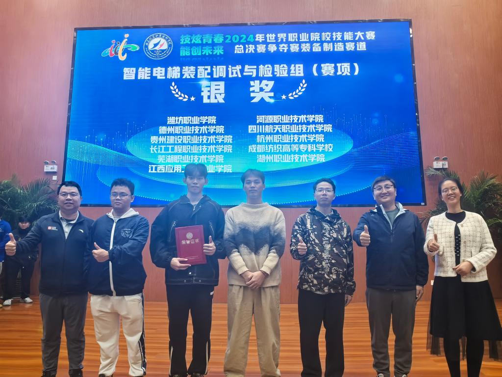 10月29日—30日,以“技炫青春能创未来”为主题的2024年世界职业院校技能大赛总决赛制造装备赛道(智能电梯装配调试与检验组)争夺赛在西安航空职业技术学院隆重举行。该赛项属于装备制造赛道,涵盖高职院校机械设计制造类、机电装备类及自动化类等多个专业,来自全国29个省、自治区、直辖市的58支职业院校代表队300余名师生参赛。我校派出伍懿美、苏文斌两位指导老师及张楚钧、冯海彬、陈郅博、钟羽城四位同学组成的参赛团队赴西安交通职业技术学院参赛,并在争夺赛中获得银奖。