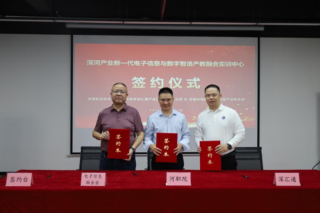 为了深化产教融合,增强职业教育的适应性,赋能河源千亿级电子信息产业发展。2024年11月1日,在深圳南山河源高新区共建产业园,举行了校企会共建深河产业新一代电子信息与数字智造产教融合实训中心签约仪式,我校袁光华副校长、科研处廖远兵处长、河源市深汇通产业园开发有限公司董事长胡建光、河源市高新区电子信息产业联合会会长邓涛以及校企会三方相关人员参加了签约仪式。