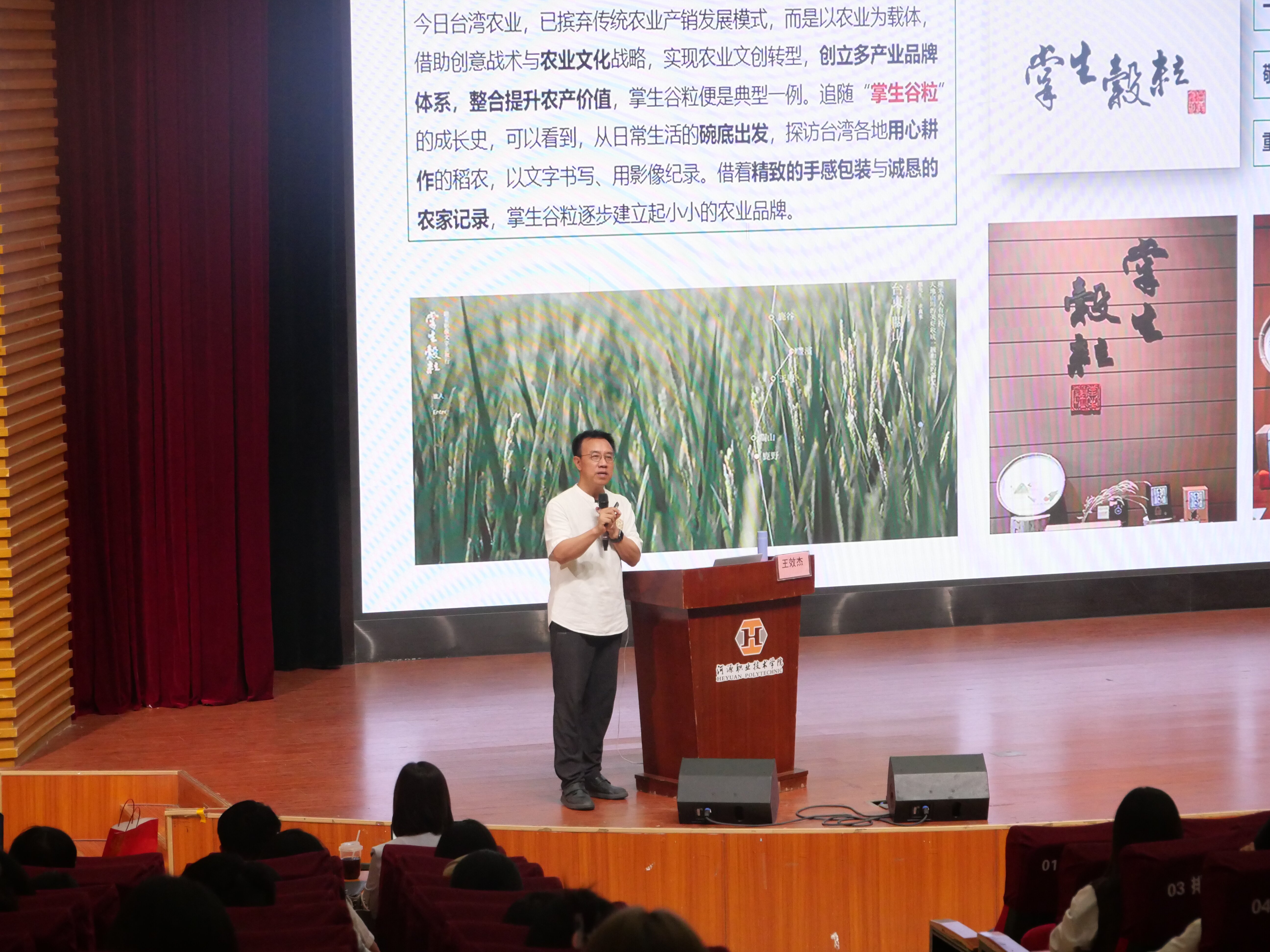 启动仪式结束后,我院特聘教授、深圳职业技术大学原动画学院院长王效杰教授为师生主讲了一场主题为“文创融合:台湾文创产业研究启示”的主题讲座。王效杰教授主要从台湾的创意农业、文创产业、文创产业的致胜途径以及文创产业的成功秘诀四个方面对文创融合进行了阐述。在阐述中,王效杰教授通过自己亲身调研和研究,以及每一个文创融合的具体案例,深入浅出地剖析了台湾地区文创融合的主要途径、成功经验和对河源生态农业文创融合的启示。王效杰教授的讲座从艺术、文化的视角探讨了创意生态农业的发展,让我们体会到了文化艺术与生产生活的紧密关联,以及文化艺术在人类社会发展中的重要作用。