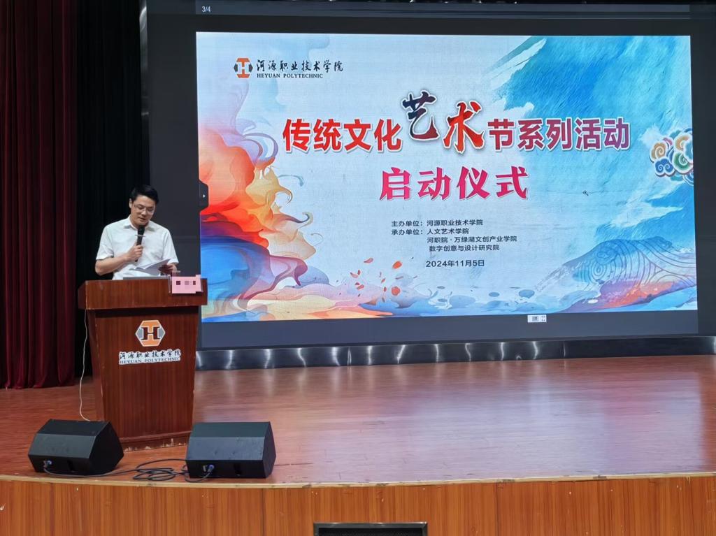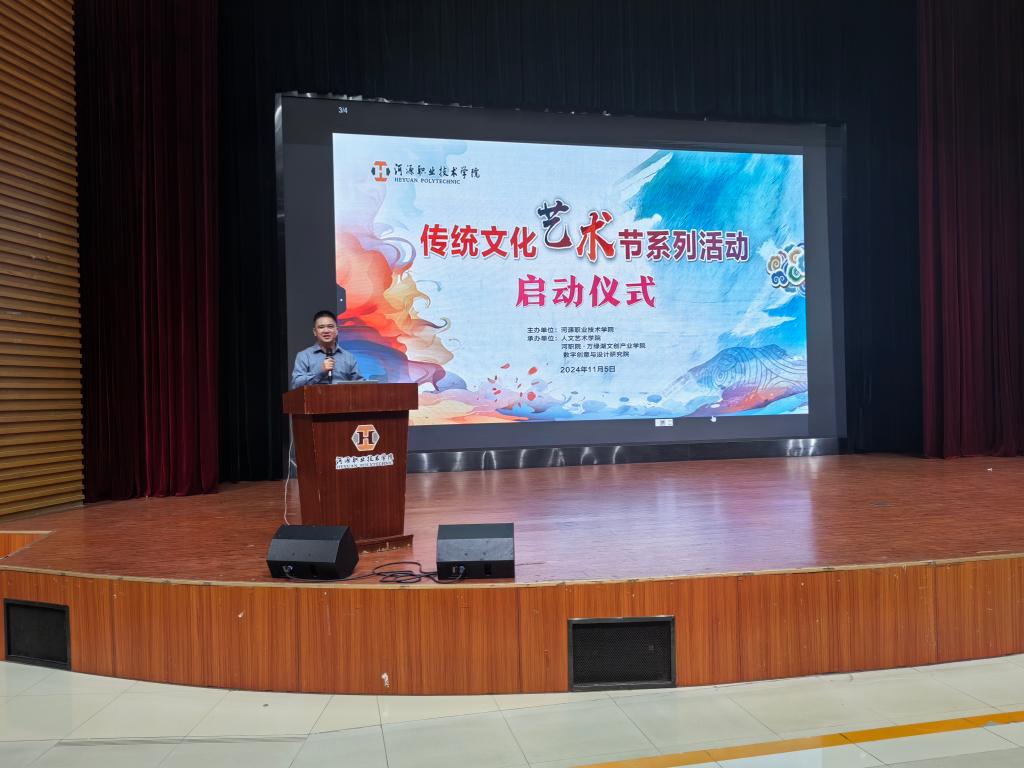 在启动仪式上,张超副书记介绍了本次传统文化艺术节的方案。据介绍,本次传统文化艺术节主要由人文艺术学院承办,于2024年11月-2025年1月期间面向全校师生开展各类活动,活动共分为五个部分:一是传统文化艺术系列讲座,二是职业技能竞赛,三是传统文化艺术作品展,四是非遗文化、文创产品进景区,五是河源市非物质文化遗产项目科普展。张超副书记表示,此次传统文化艺术节是展示中华优秀传统文化及河源地方文化,提高文化自信的重要形式,希望同学们踊跃参加、积极创作。
