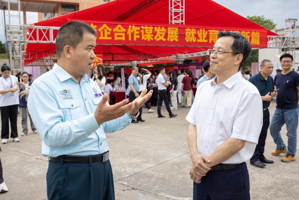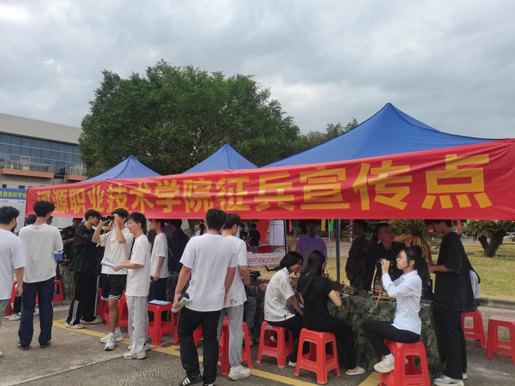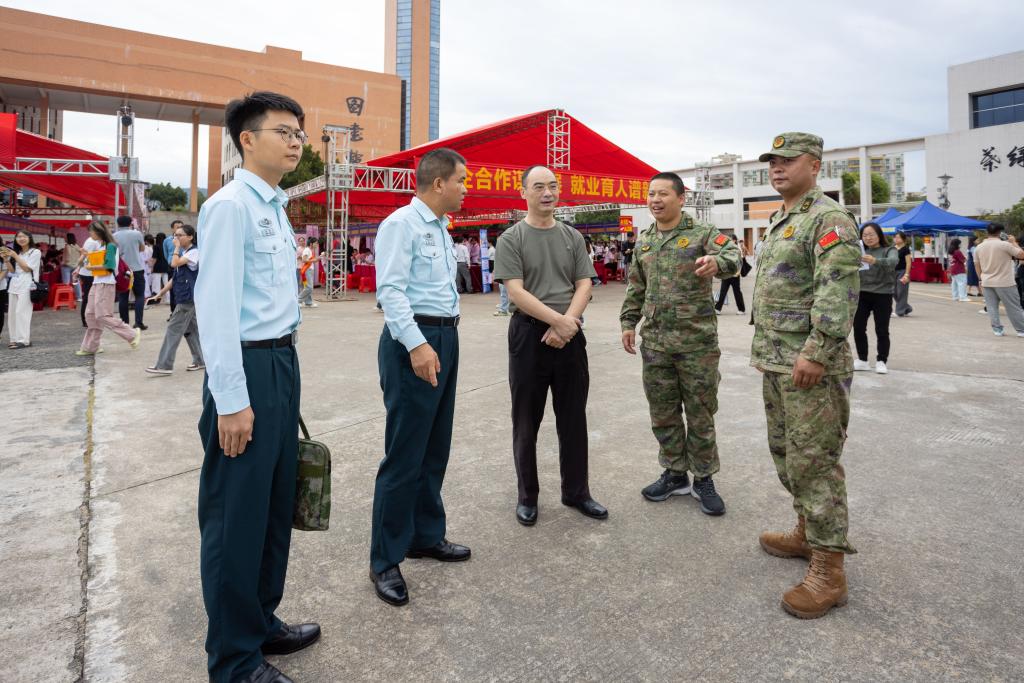 为响应国家号召,鼓励大学生积极参军入伍,11月14日,在河源军分区动员处的指导下,我校武装部组织强有力的征兵宣传工作队,深入由我校举办的“广东省2025届普通高校毕业生系列供需见面会(河源地区专场)”一线,广泛开展征兵宣传咨询活动,鼓励毕业生积极报名应征。学校党委书记韦荣、校长刘贻新、党委副书记纪委书记钟茂开、副校长赖小景、河源军分区动员处庞兴盛副处长等领导到现场指导工作。