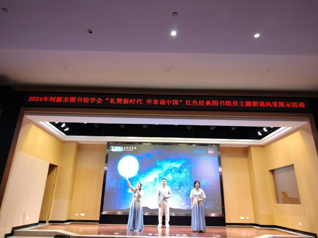 11月25日,河源市图书馆学会举行红色经典图书馆员朗诵风采展示活动,我校图书馆选派参加的两支队伍分别获得一等奖和二等奖。