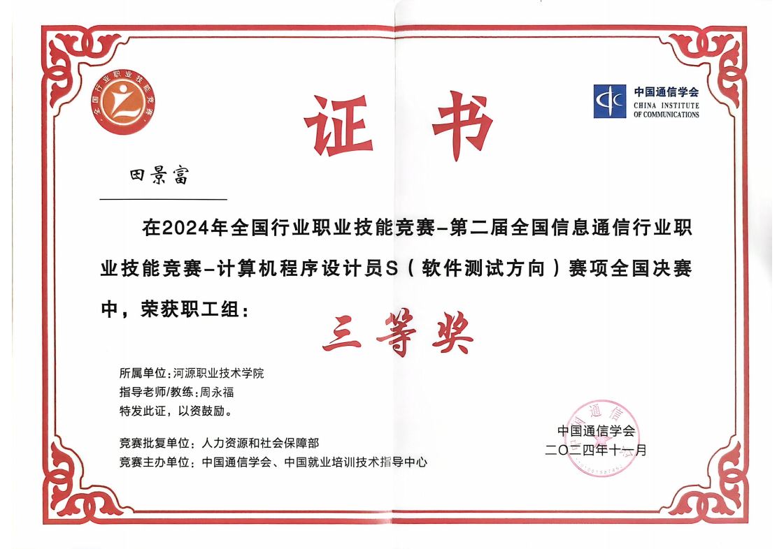 11月25日至27日,在广西职业技术学院举行的2024年全国行业职业技能竞赛——第二届全国信息通信行业职业技能竞赛计算机程序设计员S“软件测试”的全国决赛中,我校田景富老师荣获三等奖。软件测试比赛同样分为理论知识和实际操作两部分;理论知识部分采用客观题形式,通过机考进行,实际操作部分则围绕交易管理系统展开,要求参赛者使用软件测试技术对被测系统的安全性、稳定性、功能性做全面测试,帮助企业规避系统运行风险。该赛项重点考察单元、接口、功能、性能、自动化等测试技术的熟练运用,旨在挖掘和培养具有创新思维和实践能力的软件测试人才,保障软件系统行稳致远,推动软件测试技术的创新与发展。