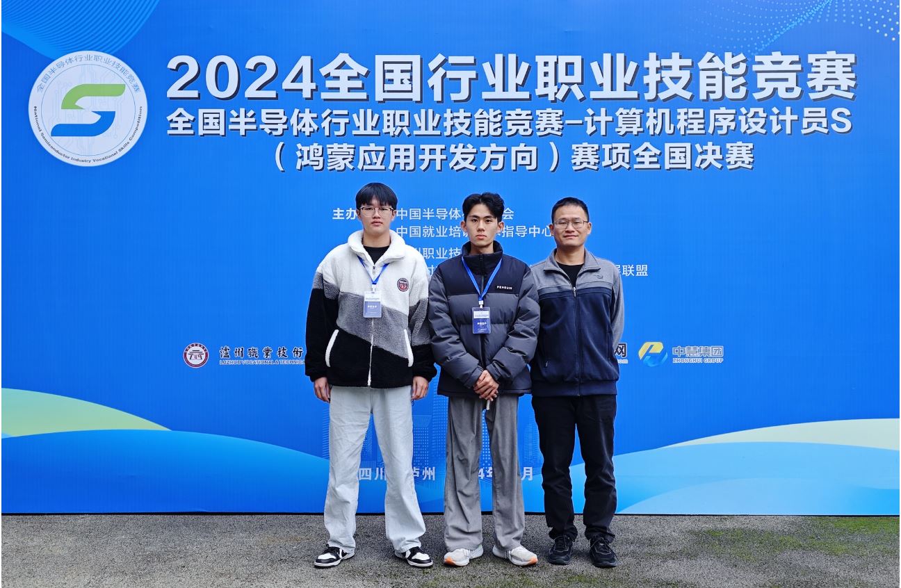 12月6日至8日,2024年全国行业专业技能竞赛——全国半导体行业职业技能竞赛计算机程序设计员S“鸿蒙应用开发”赛项全国决赛在泸州职业技术学院举行。我校软件技术专业杨浪老师荣获职工组二等奖,22级软件技术专业1班张佳伟和陈衍颖同学分别荣获学生组一等奖和三等奖。