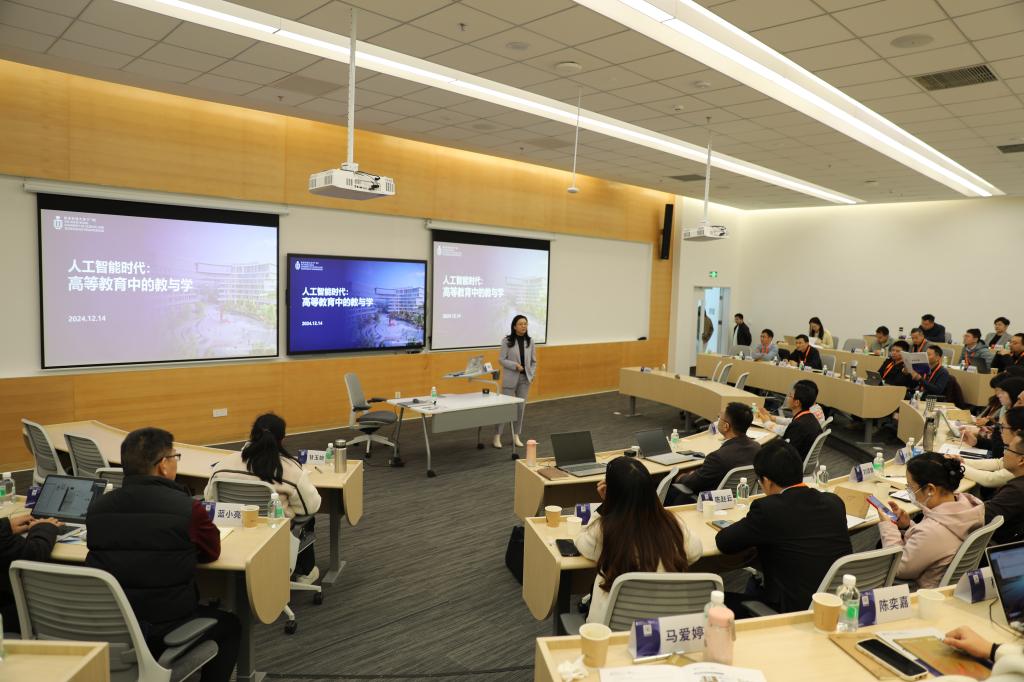 接下来,教学发展处处长郭娇博士以“人工智能时代的教与学”为主题,为学员们带来了一场思想碰撞的课堂。郭教授从人工智能技术的迅猛发展谈起,深入剖析了其对传统教学模式的冲击与影响。她指出,人工智能不仅改变了知识的获取方式,更促使教师必须转变角色,从传统的知识传授者转变为学习引导者和创新促进者。通过展示一系列国内外高校在人工智能教育领域的成功案例,郭博士鼓励学员们要勇于尝试新技术,不断创新教学方法,以适应新时代学生的学习需求。