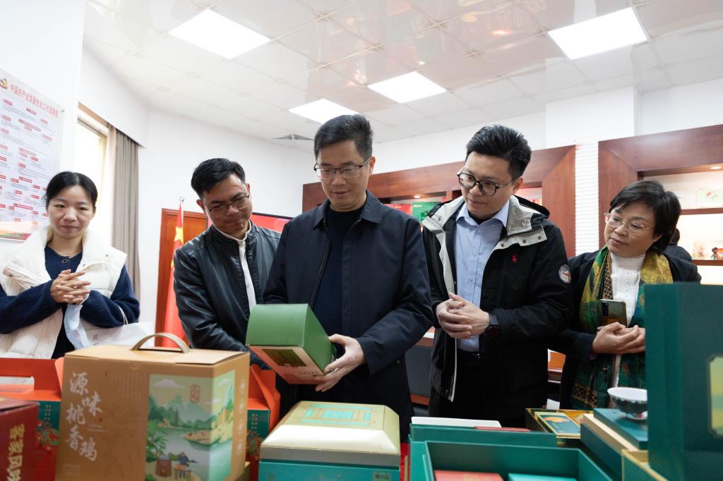会议分两段进行。首先是学校党外人士调研交流座谈会。会议开始前,在丘碧科、黄柳铭等的陪同下,参会人员实地参观考察了河源手信的特色产品,了解了手信公司的成立背景、品牌形象、市场定位,以及我校参与部分特产的包装设计、大学生助农电商销售等合作情况。