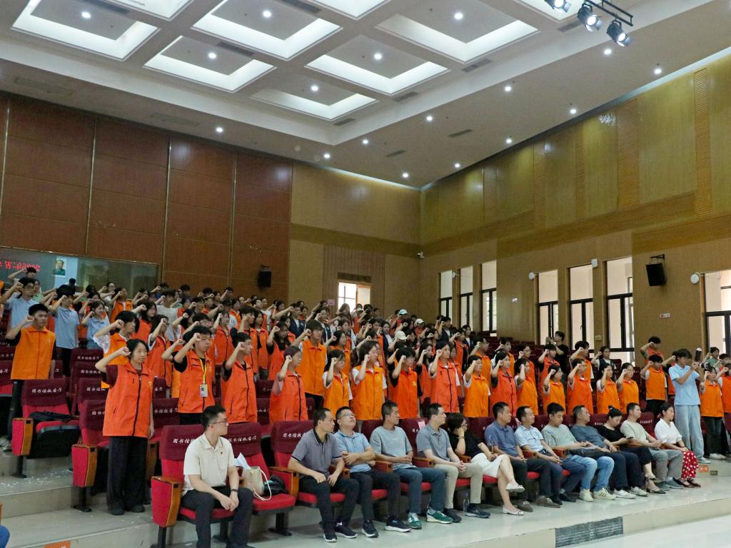 仪式在2024年暑期"三下乡"活动回顾视频中拉开帷幕。视频生动展现了2024年暑期我校学子深入基层、服务社会的精彩瞬间,激发了在场师生投身实践的热情。随后,志愿者代表姚华杰发言,他分享了参与社会实践的初心,并代表全体志愿者表达了"用专业知识服务社会,用青春汗水浇灌梦想"的决心。教师代表袁炫芳向所有团队成员和指导老师分享三点经验:一是要永葆初心,扛起青年担当。二是要扎根基层,洞察时代需求。三是要创新传播,讲活实践故事。紧接着,杨旭辉同学带领全体实践团队成员庄严宣誓。