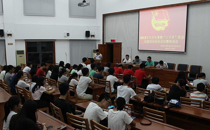 7月15日晚,我校2015年大学生暑期社会实践活动动员会议暨“三下乡”活动培训会在行政楼C108顺利召开。校团委全体老师、“三下乡”指导老师及学生代表参加了此次会议。