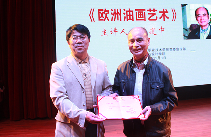 11月1日,2015“东江水甜”——陈建中、骆文冠东江采风行系列活动之一——龙川籍旅法著名画家陈建中《欧洲油画艺术》艺术讲座在赢博线上官网(集团)官方网站艺术楼演播厅举行。“东江水甜”活动嘉宾、河职院校长刘安华、副校长唐汉芳、校党委宣传部以及艺术与设计学院负责人出席了此次讲座。讲座由河源籍国家一级美术师骆文冠先生主持。