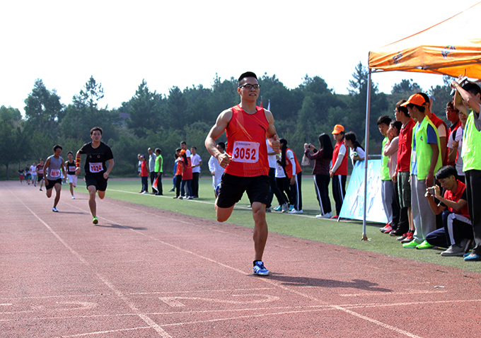 当比赛的哨音响起,各位教职工在起跑线前热身完毕,便绷紧全身的每一根神经。发令枪响,全场的气氛都被点燃了,跑道上的教职工们如脱缰的野马一样飞出去,如八道闪电向终点掠去。古伟民老师从出发起便一马当先,只见他不断加速,转眼间,他便冲过了终点,以11秒71获得本项目冠军。来自机电学院的易志华老师和机关工会的黄志远老师,分别以12秒84以及13秒52的成绩分获亚、季军。