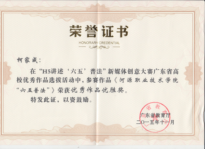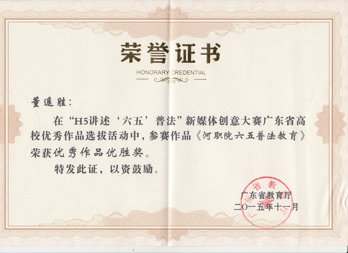 活动共收到来自全省25所高校报送的作品165件,经评审,共评选出优秀作品64件,其中一等奖3件,二等奖5件,三等奖10件,优胜奖46件;该我校电信学院组织报送了3件作品,均获得优胜奖,分别是:《河职院“六五”普法工作自查报告》(计算机多媒体技术专业:郑永涛)、《赢博线上官网(集团)官方网站“六五普法”》(计算机多媒体技术专业:柯家成)、《河职院六五普法教育》(软件技术专业:董遥胜)。